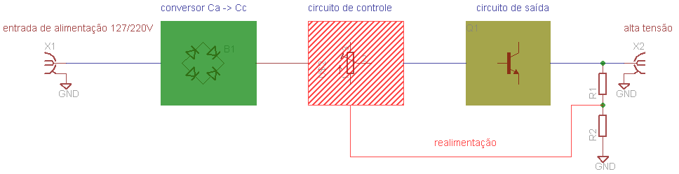De forma simplificada, é atribuição do circuito de controle gerar sinais que possibilitem a obtenção de altas voltagens na saída da fonte de alimentação. Um elo de realimentação “olha” para a tensão de saída e compara a mesma com o valor que foi definido pelo operador; se há divergência entre o valor ajustado e o valor gerado uma correção é efetuada. Existe, entretanto, uma limitação: se a carga ligada na saída desta fonte tiver um valor de resistência elétrica muito baixa, drenando uma corrente elétrica alta o suficiente, isto pode fazer com que o circuito de controle, que tem limitações de faixa de operação, deixe de regular adequadamente a tensão de saída.