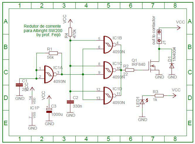 Decidi então comprar uma contactora comercial americana (modelo Albright SW200), e quando ela chegou e fui testar seu funcionamento descobrí que ela consome quase 2 amperes em 12 V para ficar acionada! Entretanto, uma vez acionada com esta corrente, pode-se diminuir consideravelmente a corrente de manutenção da mesma sem que ela desarme. Com PWM´s na cabeça decidi construir um circuito redutor de corrente para uso com minha contactora, que descrevo a seguir.