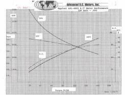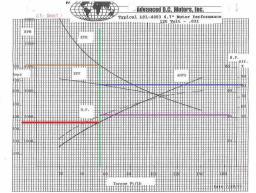 Partindo do valor de 350 A à esquerda na coluna "AMPS" tracei a linha vermelha até encontra a curva "AMPS". Neste ponto tracei a linha vertical verde que informa o torque em pés/libras (Ft/Lb). Esta linha verde marca pontos de intersecção com a curva de eficiência (EFF) e rotações (RPM). No exemplo dado, a 350A e com um banco de , por exemplo, 10 baterias (120V), é esperado que a tensão no motor seja de 120V-(0,03*350A)= 109,5V (se supõe que a resistência série da alimentação e conexões seja de 30 mili-ohms) e para isto termos um torque de 56 Ft/Lb, 42 Hp, 84% de eficiência e 4200 RPM.
