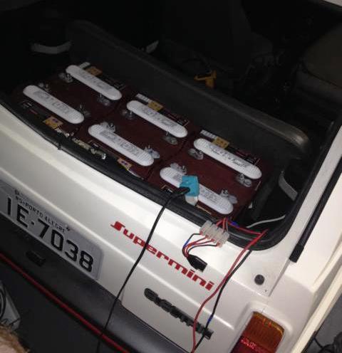 Após estudar as especificações de diversas baterias nacionais e importadas e descartar um conjunto de baterias de lítio por causa do investimento necessário, adquirí um conjunto de 9 baterias (com a ajuda do amigo Hannes, do grupo veículos elétricos do Google) marca Trojan modelo T-875, de 8 volts, 170 Ah @ 20h. O Gurgel supermini é bem limitado em termos de espaço, e o aumento de 6 para 9 baterias demandou um estudo cuidadoso e a reformulação da instalação das baterias.