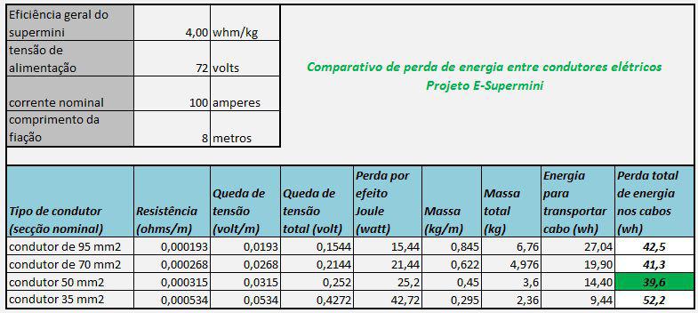 De acordo com esta avaliação, condutores de 50 mm2 pesam mais, mas a perda introduzida por efeito Joule é menor, fazendo com que a perda total seja inferior à aquela usando cabos de 35 mm2. Já cabos de maior bitola, apesar de apresentarem perdas por efeito Joule cada vez menores com o aumento do diâmetro, por causa da sua massa consomem proporcionalmente mais energia. Com os parâmetros levantados durante o uso do Supermini na sua primeira fase e com estas considerações decidi trocar a fiação principal para cabos com 50 mm2 pois à velocidade de cruzeiro (60 km/h) o consumo aproxima-se dos 100A e com esta corrente esta bitola de fio apresenta a melhor relação de perdas. Veículos com consumod e cruzeiro maior podem demandar por cabos de maior bitola, mas isto não é regra! Resumindo, vale a pena estudar o assunto quando fizer o projeto e eventualmente optar por cabos mais grossos mesmo que cabos mais finos (e leves) suportem a sua demanda de corrente.