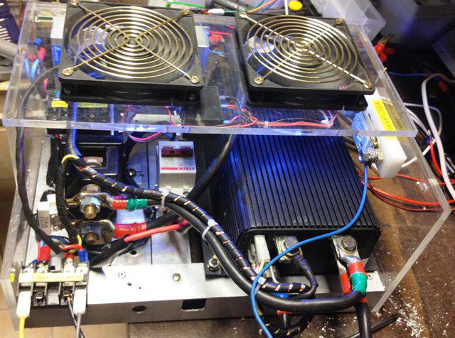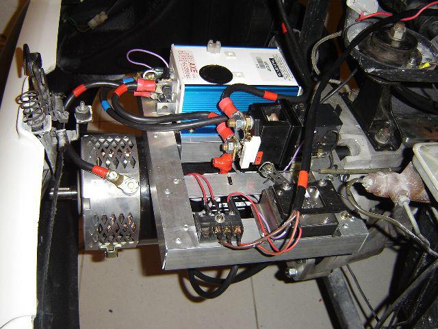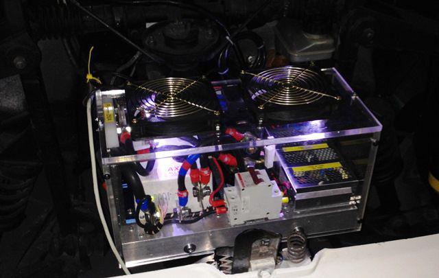 Como estou permanentemente modificando coisas no Supermini para melhora-lo, decidi modificar a montagem mecânica de toda a perte elétrica de controle do motor. A idéia foi construir tudo em uma estrutura modular que possa ser retirada sem dificuldade e levada para a bancada para testes e modificações, mas ao mesmo tempo protegendo todos os componentes das condições adversas a que se encontram durante o suo normal - poeira, poluição, água, etc. Com este objetivo construí um sub-chassi de duralumínio recoberto por placas de acrílico transparente que isola toda a parte de controle do motor e ao mesmo tempo permite sua visualização ao abrir o capô. Neste conjunto foi colocado um conversor de 72 volts para 12 volts independente daquele que alimenta todos os demais equipamentos do carro, de forma a aumentar sua confiabilidade.
