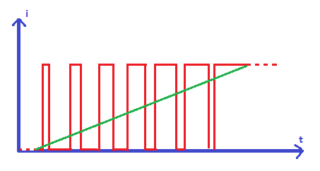 Um controlador PWM fornece corrente de saída com ciclo de trabalho variável. Na figura representa-se a corrente fornecida ao motor à medida que vai se apertando o acelerador. A linha verde representa aproximadamente a corrente média que é aplicada ao motor, enquanto a linha vermelha apresenta o valor instantâneo.