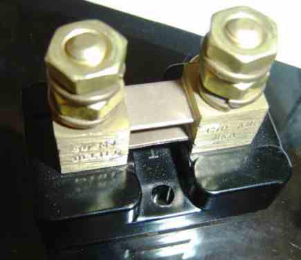 O controlador Alltrax que adquiri permite a leitura da corrente média aplicada ao motor através do uso do software disponibilizado gratuitamente. Como não tive tempo de descobrir o protocolo de comunicação empregado pelo controlador, e como pretendo construir no futuro meu próprio controlador, decidi agregar ao meu projeto um "shunt" de corrente. Um shunt é um resistor de baixo valor ôhmico que é colocado em série com o motor, e que desenvolve em seus terminais uma tensão que é proporcional à corrente que está circulando. O Shunt que adquirí desenvolve 50mV a cada 150 A que circulam sobre ele.