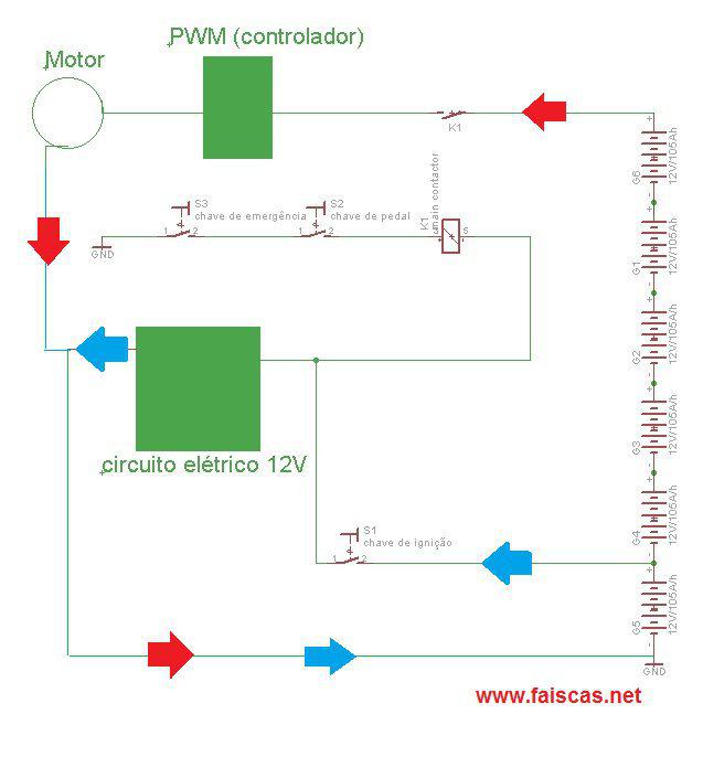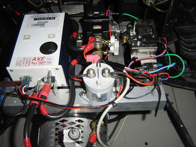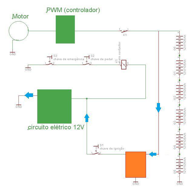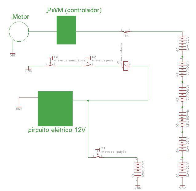 Um requerimento fundamental para a segurança de veículos elétricos é dotá-los de alguma forma de desligamento de emergência. Imagine que o controlador (chaves eletrônicos) entre em curto circuito por alguma razão - a máxima tensão sería aplicada ao motor, independentemente da posição do pedal do acelerador. Como meu projeto não prevê o uso da embreagem mecânica não haveria maneira de desconectar a alimentação e parar o veículo se não for possível desligar as baterias. Com esta finalidade os veículos elétricos incorporam a chamada "contactora" : uma chave eletromagnética que permite ligar e desligar um circuito de alta corrente como o que alimenta o motor.