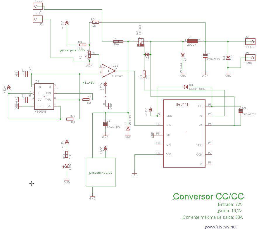 Conforme já comentei antes optei por usar um conversor CC/CC ao invés de uma bateria auxiliar para alimentar os circuitos herdados do Supermini e que são de 12 volts (pisca pisca, rádio, limpador, etc.). Anteriormente utilizei uma fonte de PC modificada mas a mesma tem limitação quanto à potência de saída máxima, e uma vez atingida a corrente máxima ela se desliga (entra em operação o circuito de proteção do PWM e ela para de funcionar). No meu caso isto aconteceu algumas vezes em dias de chuva quando além da iluminação normal do carro eu acionei o limpador de parabrisas e o ventilador para desembaçar os vidros. Não chega a ser um problema muito sério pois eu dotei o circuito de um relé que na ausência dos 12 volts do conversor comutava tudo para a primeira bateria do pack de tração. Isto ocasionalmente pode provocar uma descarga maior nesta primeira bateria, e para evitar isto decidi trabalhar em um conversor mais potente (mas sem ter que adquirir um produto pronto).