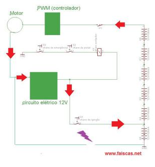 O próximo passo no projeto foi definir o controlador de corrente para o motor. O controlador é um dispositivo eletrônico que permite variar a corrente elétrica que circula pelo motor, permitindo desta forma ajustar sua velocidade. Os controladores de motor série como o que elegí utilizam invariavelmente a técnica PWM, acrônimo que significa modulação por largura de pulso. Esta técnica consiste em ligar e desligar rapidamente o motor às baterias, e através da variação do percentual do tempo em que as baterias ficam ligadas ao motor versus o tempo em que permanecem desligadas ajusta-se sua velocidade. Poderiamos imaginar que colocamos uma chave mecânica entre o motor e as baterias e que uma pessoa ligasse a chave por um período e desligasse em seguida, e passado mais algum tempo ela tornasse a ligar a chave. A relação de tempo ligada e desligada dá em ultima análise um valor médio, que quanto maior (ou seja maior o tempo de chave ligada em relação ao tempo de chave desligada) permite ajustar a velocidade do veículo. Esta operação de ligar e desligar a chave é feita nos controladores em velocidades de 10.000 ciclos por segundo ou mais.