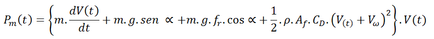 A estimativa da demanda de potência a ser fornecida pelo mecanismo de tração (Pm) é estimada pelo produto da velocidade com a força necessária para tracionar o veículo, ou seja,